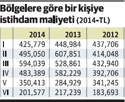 Bir kişiye iş sağlamak için 1’nci Bölge’de 425 bin 779 liralık yatırım gerekirken, aynı maliyet 6’ncı Bölge’de bunun yarısından bile az. Yani 6’ncı Bölge’de 201 bin liralık yatırımla bir kişiye istihdam sağlanabiliyor. Dünya Gazetesi’nin Ekonomi Bakanlığı’nın teşvik belgeli yatırımlara ilişkin verilerinden yaptığı analize göre yerli sermaye bir kişilik istihdam için 385 bin 84 lira, yabancı sermaye ise 928 bin 14 liralık yatırım yaptı.