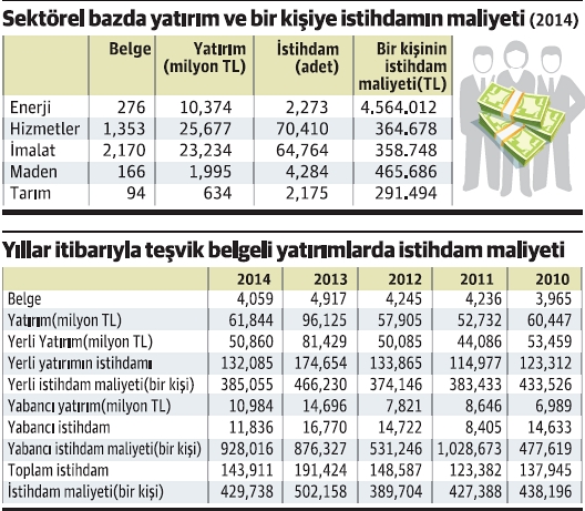 Doğası itibarıyla çok fazla istihdam yoğun olmayan enerji sektöründe bir kişiye istihdam yaratmanın maliyeti, diğer sektörlerin neredeyse 10 katı düzeyinde bulunuyor. 2014 yılı verilerine göre enerji sektöründe yapılan yatırımların, bu yatırımda çalışacak kişilere bölünmesiyle bulunan maliyet 4 milyon 564 bin lira gibi çok yüksek düzeyde hesaplandı. Bir kişinin istihdam maliyeti hizmetler sektöründe 364 bin 678 lira, imalat sanayiinde 358 bin 748 lira, madencilikte 465 bin 686 lira, tarım sektöründe ise 291 bin 494 lira olarak hesaplandı.