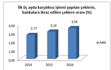 Rapora göre 2016 yılının ilk çeyreği, önceki iki seneye kıyasla karşılıksız yazılan çek oranında en kötü yıl olarak değerlendiriliyor. 2015 yılında karşılıksız yazılan çek oranı yüzde 14 artarken 2016 yılında artış oranının yüzde 12 olduğuna dikkat çeken rapora göre karşılıksız çek oranı (adet bazında) her yıl yüzde 10’un üzerinde artış gösteriyor. Bankaya ibraz edilen çek sayısı artmamasına rağmen karşılıksız yazılan çek oranının ve sayısının artması, karşılıksız yazıldıktan sonra ödenen çek sayısındaki önemli düşüş; geçen yılın ilk çeyreğinde yüzde 2.3, tamamında ise yüzde 4 büyüyen Türkiye ekonomisinde başka bir takım sorunlara işaret etmektedir.