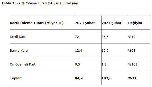 Bankalararası Kart Merkezi (BKM), 2021 yılının şubat ayına ilişkin kartlı ödeme verilerini açıkladı.