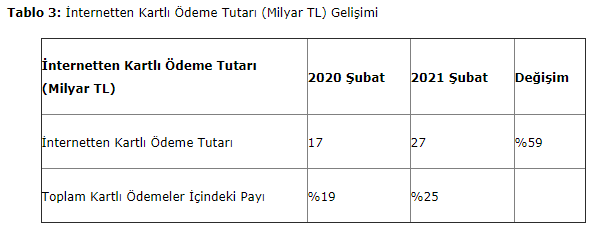 İnternetten kartlı ödemeler hayatın her alanında tercih edilmeye devam ederken marketten yemek siparişlerine, perakendeden vergi ödemelerine kadar hızla yaygınlaşmaya devam ediyor. İnternetten kartlı ödeme tutarı şubat ayında, geçen yılın aynı dönemine göre yüzde 59 artarak, 27 milyar TL’ye ulaştı. İnternetten kartlı ödemelerin toplam kartlı ödemeler içindeki payı ise, geçen yıl şubat ayında yüzde 19 iken bu yıl yüzde 25’e ulaştı; yani her 4 TL kartlı ödemenin 1 TL’si internetten gerçekleşti.