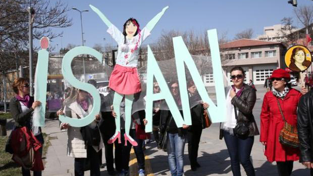 Ellerinde erkek şiddeti yüzünden hayatlarını kaybeden kadınların fotoğraflarını taşıyan kadınlar, miting boyunca erkek şiddeti, kadın cinayetleri, kadın bedeni üzerine yürütülen politikaları protesto etti. 8 Mart mitinginde Mersin’de öldürülen üniversite öğrencisi Özgecan Aslan da unutulmadı. Özgecan için “Yasta değil, isyandayız” yazılı dev pankart taşındı.