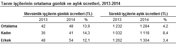 Tarımsal işletmelerde (hanehalkı) geçen yıl mevsimlik tarım işçilerinin günlük ücretleri 2013 yılına göre yüzde 13,9 artarak 48 lira, sürekli tarım işçilerinin aylık ücretleri ise yüzde 4,2 artarak bin 284 lira olarak gerçekleşti.